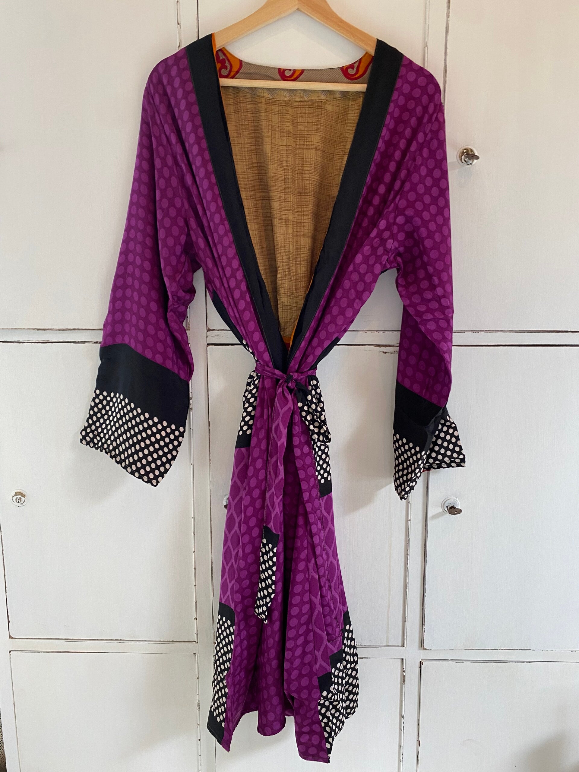 De mooie kimono's van zijde zijn aan allebei de kanten te dragen. De kimono's zijn van gerecycled zijde gemaakt. Ze zijn in verschillende printen en designs. Dat maakt het juist zo leuk om ze te dragen. Ze zijn niet super dun maar wel lekker luchtig. Omdat ze tweezijdig zijn is het makkelijk om ze nog lang door te dragen. De kimono's zijn in twee lengtes te bestellen. De Medium Kinono's zijn van goede kwaliteit. Ze zijn er in de maten M 100 cm en maat L 118 cm .