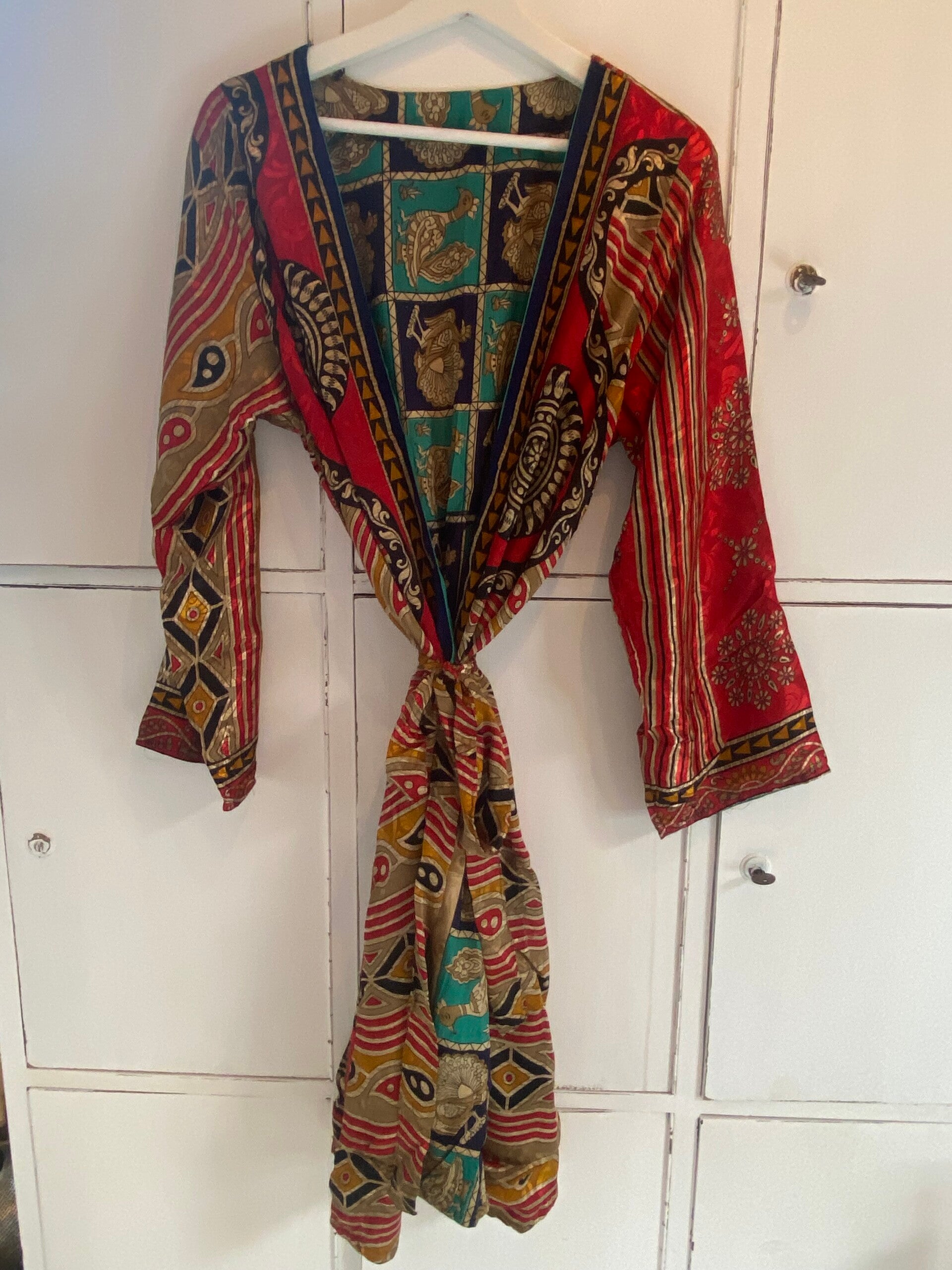 De mooie kimono's van zijde zijn aan allebei de kanten te dragen. De kimono's zijn van gerecycled zijde gemaakt. Ze zijn in verschillende printen en designs. Dat maakt het juist zo leuk om ze te dragen. Ze zijn niet super dun maar wel lekker luchtig. Omdat ze tweezijdig zijn is het makkelijk om ze nog lang door te dragen. De kimono's zijn in twee lengtes te bestellen. De Medium Kinono's zijn van goede kwaliteit. Ze zijn er in de maten M 100 cm en maat L 118 cm .