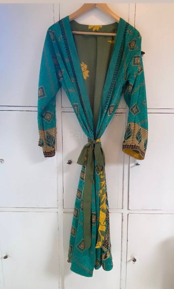 De mooie kimono's van zijde zijn aan allebei de kanten te dragen. De kimono's zijn van gerecycled zijde gemaakt. Ze zijn in verschillende printen en designs. Dat maakt het juist zo leuk om ze te dragen. Ze zijn niet super dun maar wel lekker luchtig. Omdat ze tweezijdig zijn is het makkelijk om ze nog lang door te dragen. De kimono's zijn in twee lengtes te bestellen. De Medium Kinono's zijn van goede kwaliteit. Ze zijn er in de maten M 100 cm en maat L 118 cm .