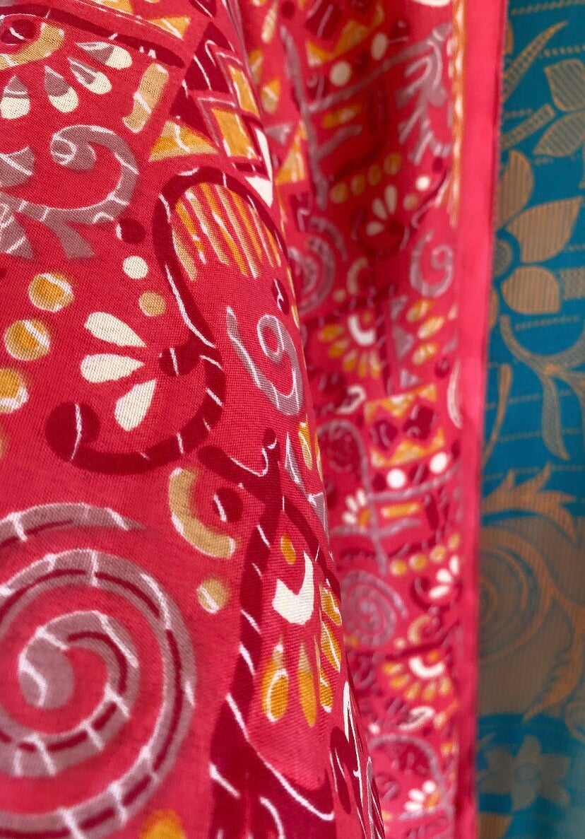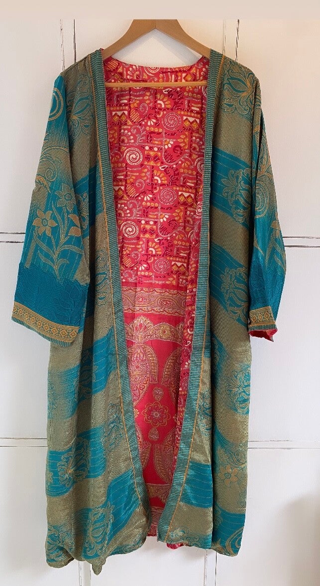 De mooie kimono's van zijde zijn aan allebei de kanten te dragen. De kimono's zijn van gerecycled zijde gemaakt. Ze zijn in verschillende printen en designs. Dat maakt het juist zo leuk om ze te dragen. Ze zijn niet super dun maar wel lekker luchtig. Omdat ze tweezijdig zijn is het makkelijk om ze nog lang door te dragen. De kimono's zijn in twee lengtes te bestellen. De Medium Kinono's zijn van goede kwaliteit. Ze zijn er in de maten M 100 cm en maat L 118 cm .