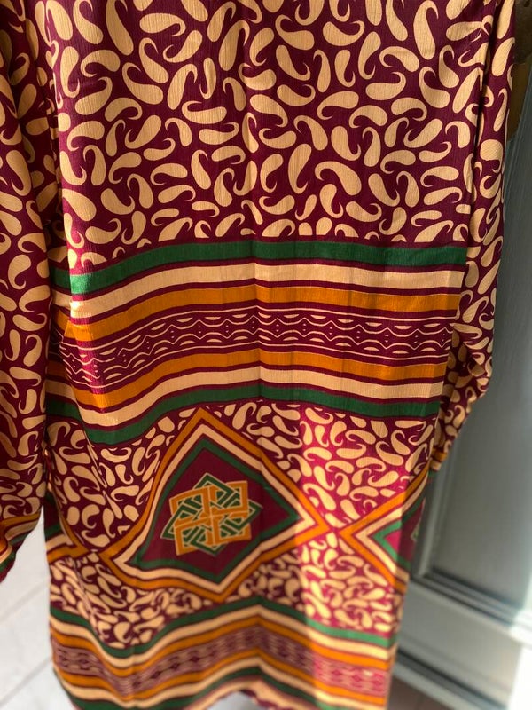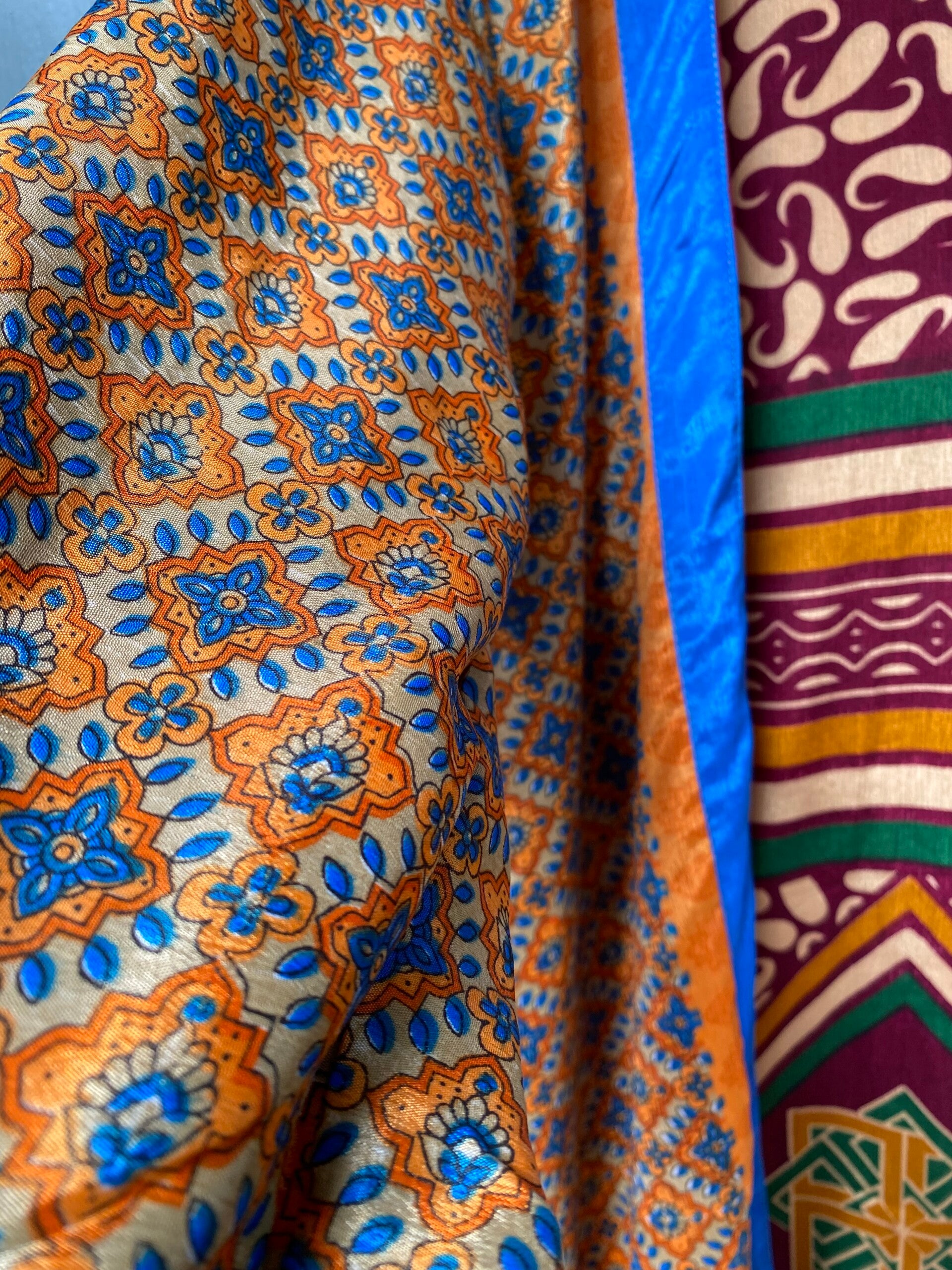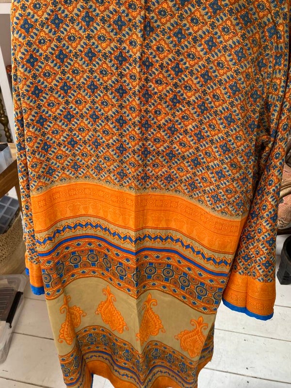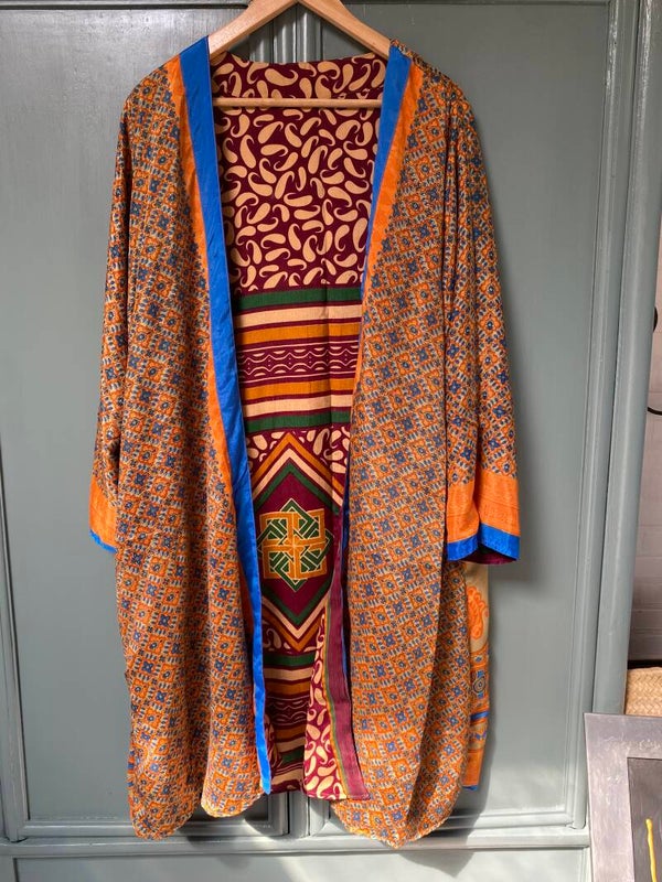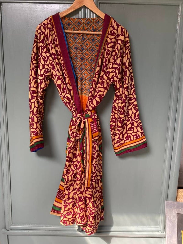 De mooie kimono's van zijde zijn aan allebei de kanten te dragen. De kimono's zijn van gerecycled zijde gemaakt. Ze zijn in verschillende printen en designs. Dat maakt het juist zo leuk om ze te dragen. Ze zijn niet super dun maar wel lekker luchtig. Omdat ze tweezijdig zijn is het makkelijk om ze nog lang door te dragen. De kimono's zijn in twee lengtes te bestellen. De Medium Kinono's zijn van goede kwaliteit. Ze zijn er in de maten M 100 cm en maat L 118 cm .