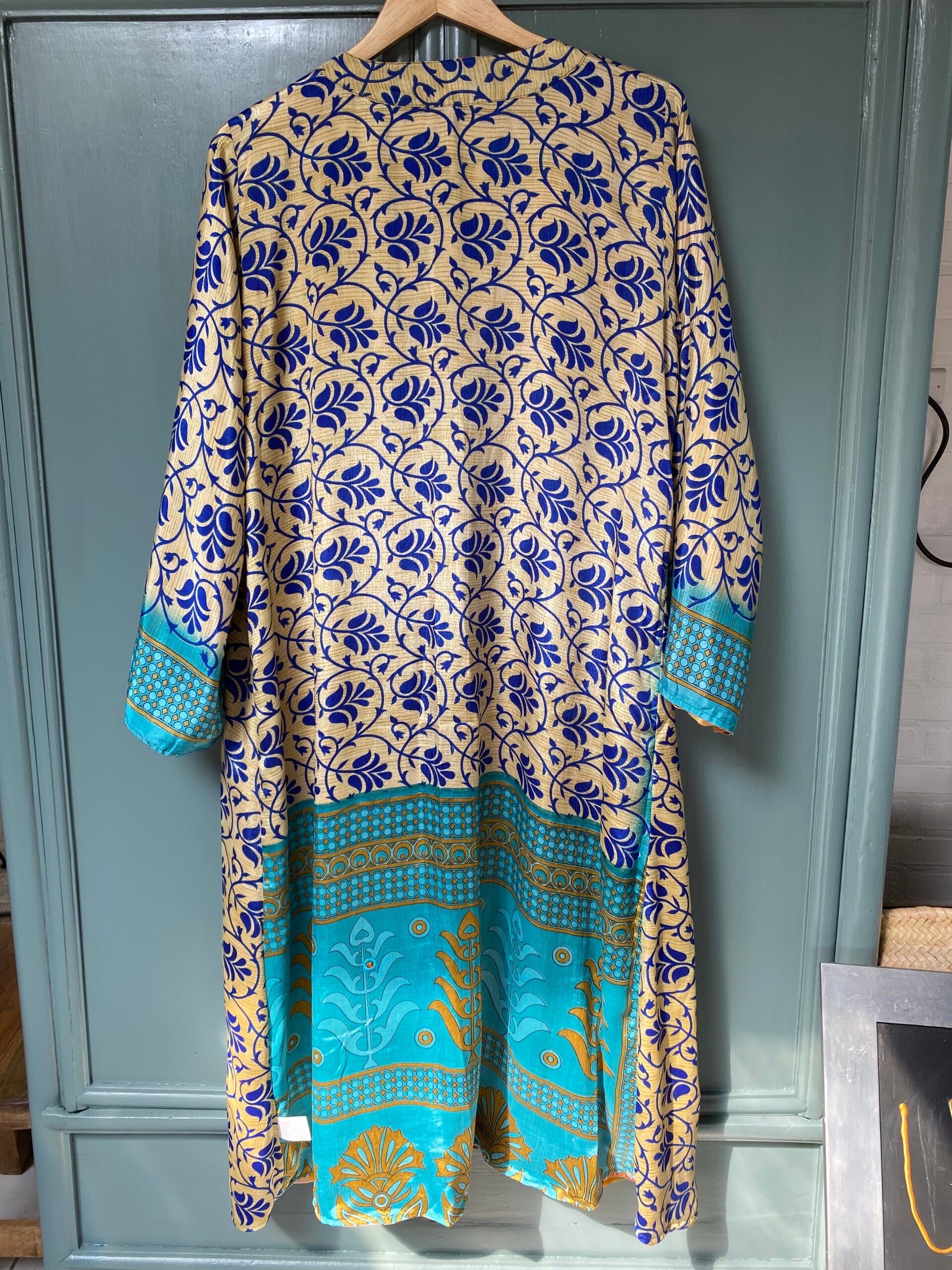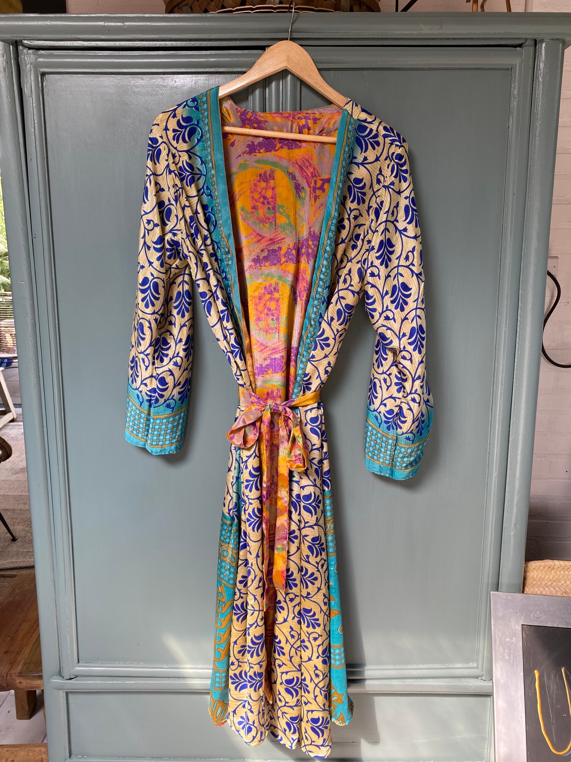 De mooie kimono's van zijde zijn aan allebei de kanten te dragen. De kimono's zijn van gerecycled zijde gemaakt. Ze zijn in verschillende printen en designs. Dat maakt het juist zo leuk om ze te dragen. Ze zijn niet super dun maar wel lekker luchtig. Omdat ze tweezijdig zijn is het makkelijk om ze nog lang door te dragen. De kimono's zijn in twee lengtes te bestellen. De Medium Kinono's zijn van goede kwaliteit. Ze zijn er in de maten M 100 cm en maat L 118 cm .