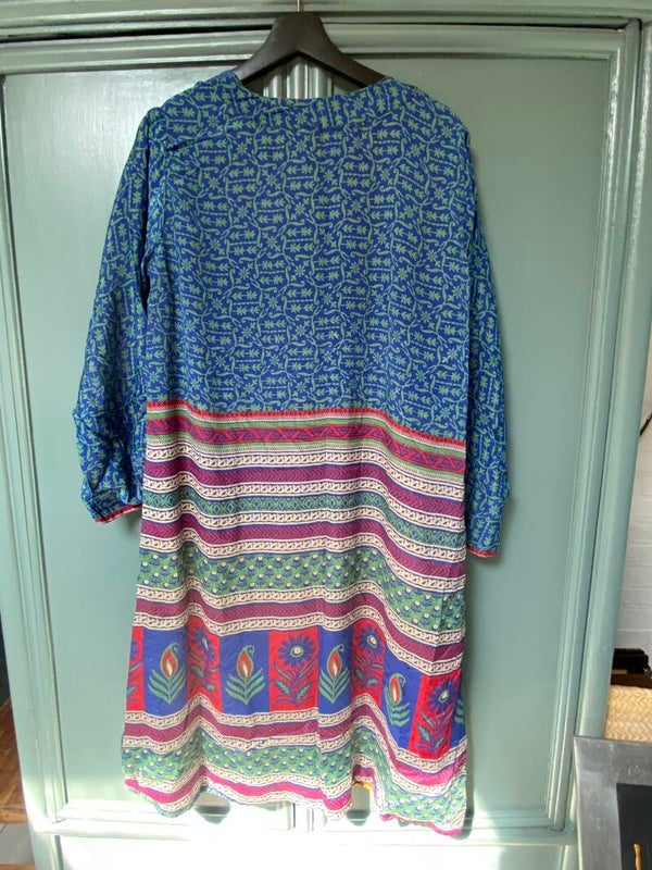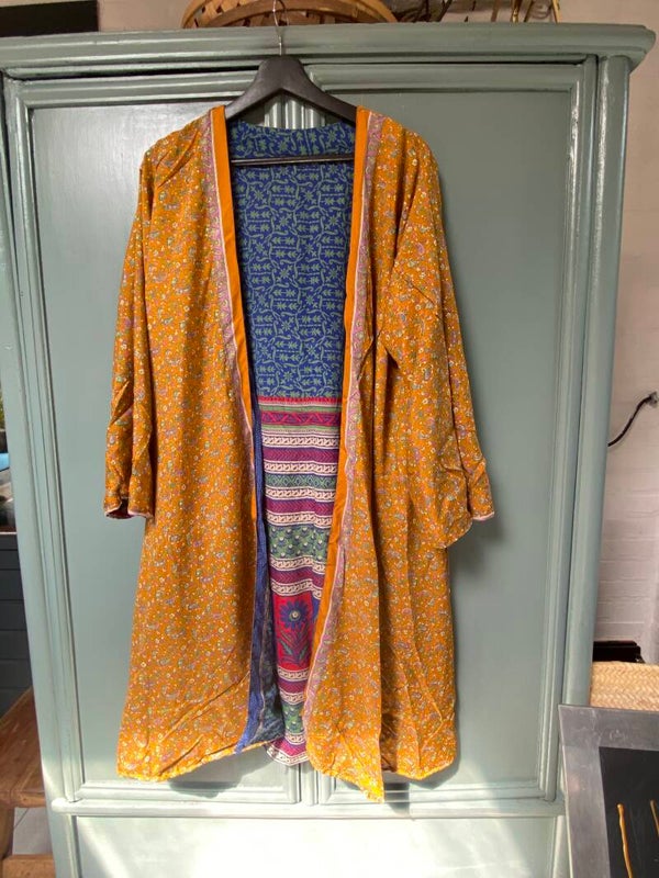 De mooie kimono's van zijde zijn aan allebei de kanten te dragen. De kimono's zijn van gerecycled zijde gemaakt. Ze zijn in verschillende printen en designs. Dat maakt het juist zo leuk om ze te dragen. Ze zijn niet super dun maar wel lekker luchtig. Omdat ze tweezijdig zijn is het makkelijk om ze nog lang door te dragen. De kimono's zijn in twee lengtes te bestellen. De Medium Kinono's zijn van goede kwaliteit. Ze zijn er in de maten M 100 cm en maat L 118 cm .