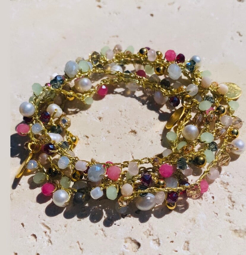 Gehaakte ketting wikkel armband van Macrame gouddraad. De ketting / armband bestaat uit geslepen glassteentjes natuursteentjes zoals rozenkwarts zoetwater pareltjes en vergulde bedeltjes.