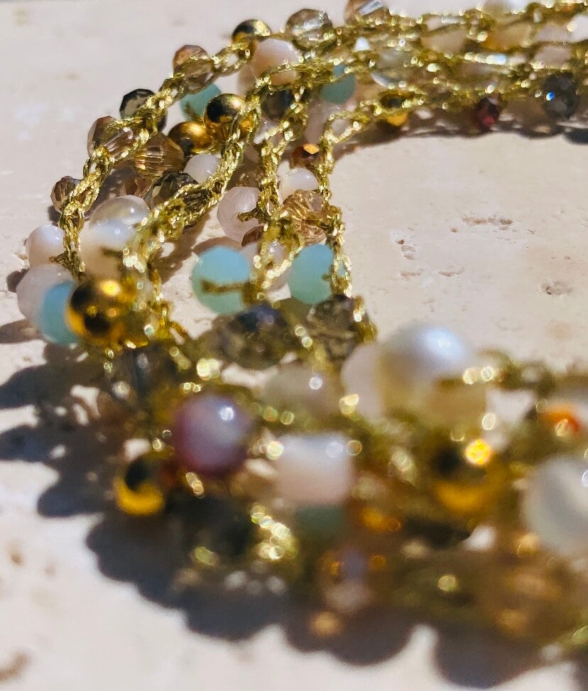 Gehaakte ketting wikkel armband van Macrame gouddraad. De ketting / armband bestaat uit geslepen glassteentjes en zoetwater pareltjes.