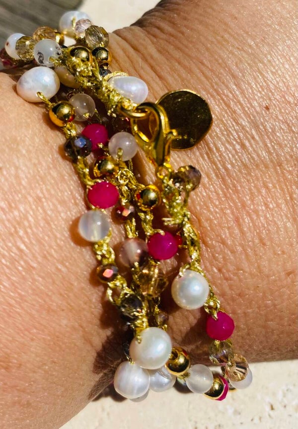Gehaakte ketting wikkel armband van Macrame gouddraad. De ketting / armband bestaat uit geslepen glassteentjes en zoetwater pareltjes en een verguld bedeltje. (Met een slotje).