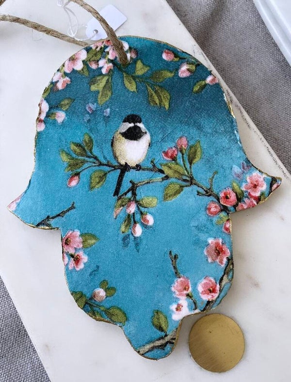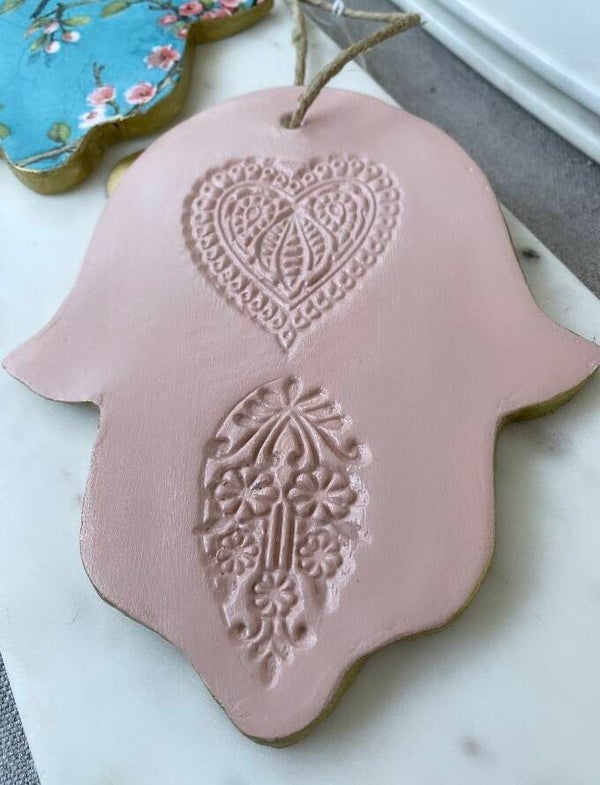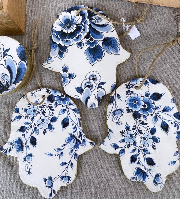 Prachtige Fatima Handen gemaakt van gebakken klei. In de kleuren Delfts Blauw Oud Rose en in een mooie bloesem afbeelding. Allemaal afgelakt. Om op te hangen of als schaal te gebruiken.
