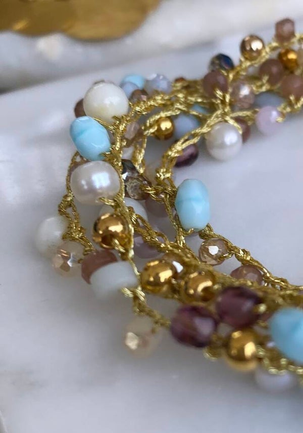 Gehaakte ketting wikkel armband van Macrame gouddraad. De ketting / armband bestaat uit geslepen glassteentjes en zoetwater pareltjes.