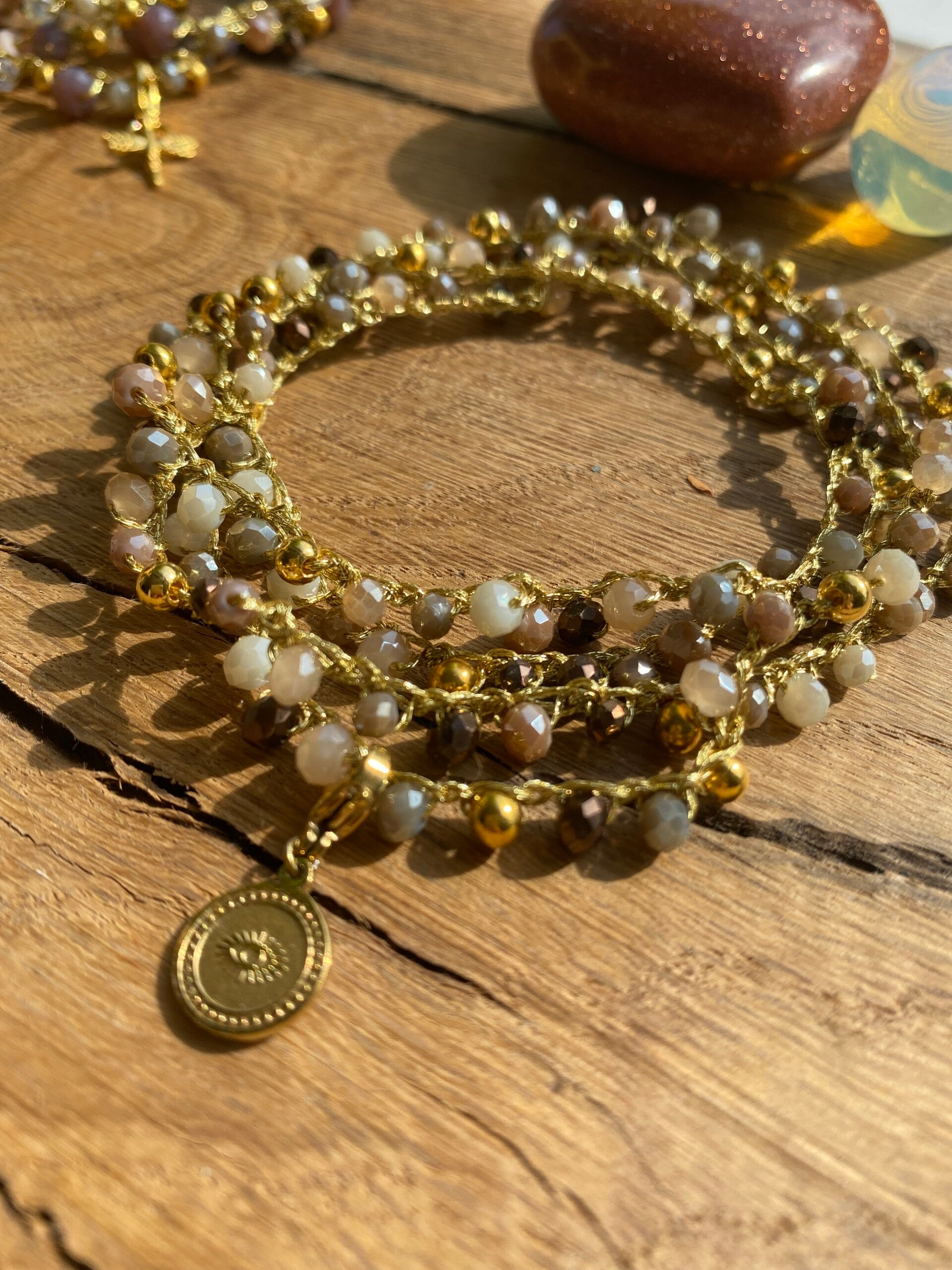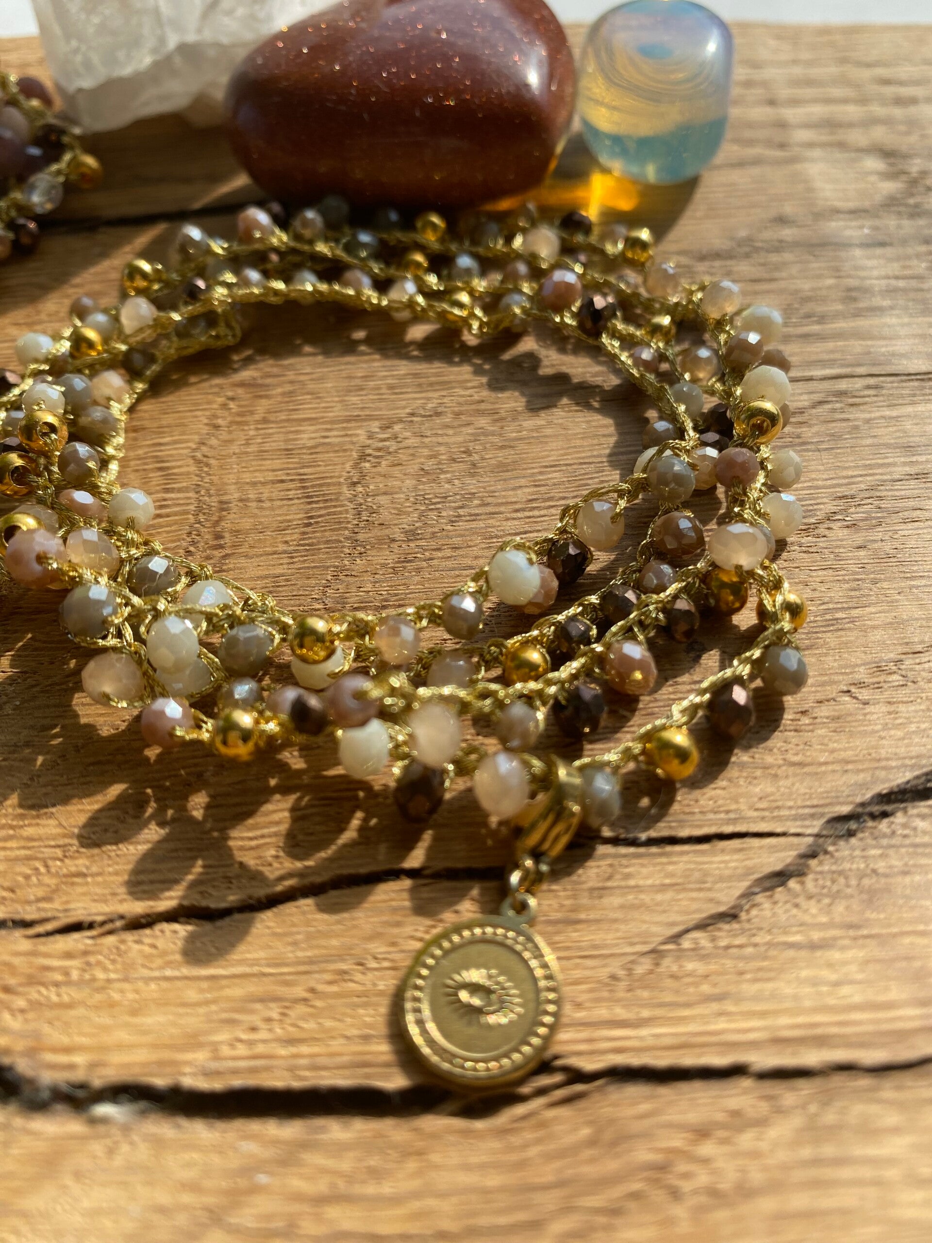 Gehaakte ketting wikkel armband van Macrame gouddraad. De ketting / armband bestaat uit geslepen glassteentjes en een bedeltje die je er ook af kan halen.
