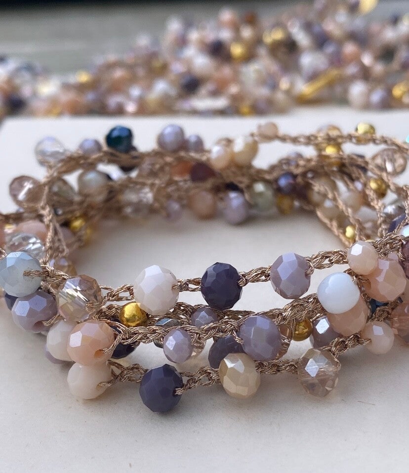 Gehaakte ketting wikkel armband van Macrame gouddraad. De ketting / armband bestaat uit geslepen glassteentjes van pastel kleurtjes.