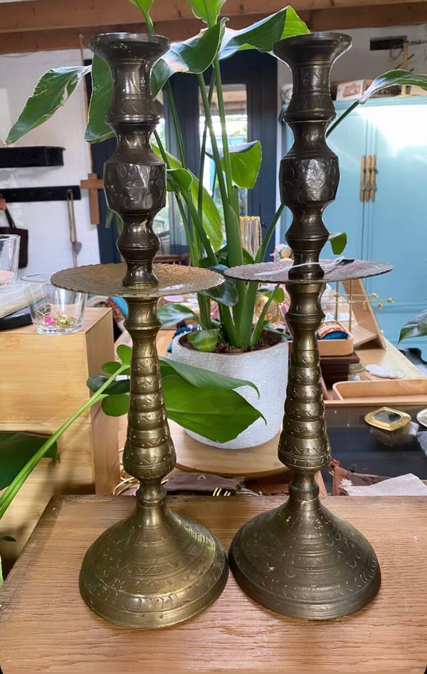 Deze twee zijn donkereder dan het glimmende koper. De een heeft iets meer glans dan de andere . Ze zijn ook best zwaar. Je komt er zelden twee zo mooi tegen.