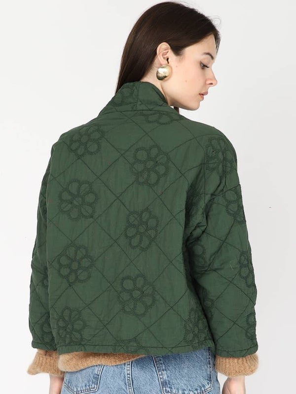Geborduurd gewatteerd jack, lange mouwen. Eén maat is geschikt voor alle maten van 36 tot 44. Dit is de kleur Groen