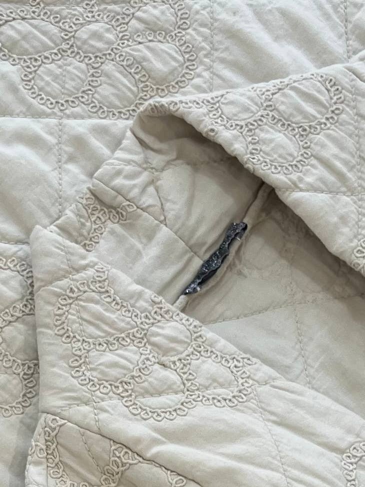 Geborduurd gewatteerd jack, lange mouwen. Eén maat is geschikt voor alle maten van 36 tot 44. Dit is de kleur Krijt Wit