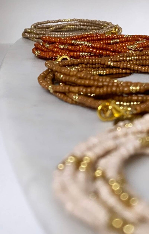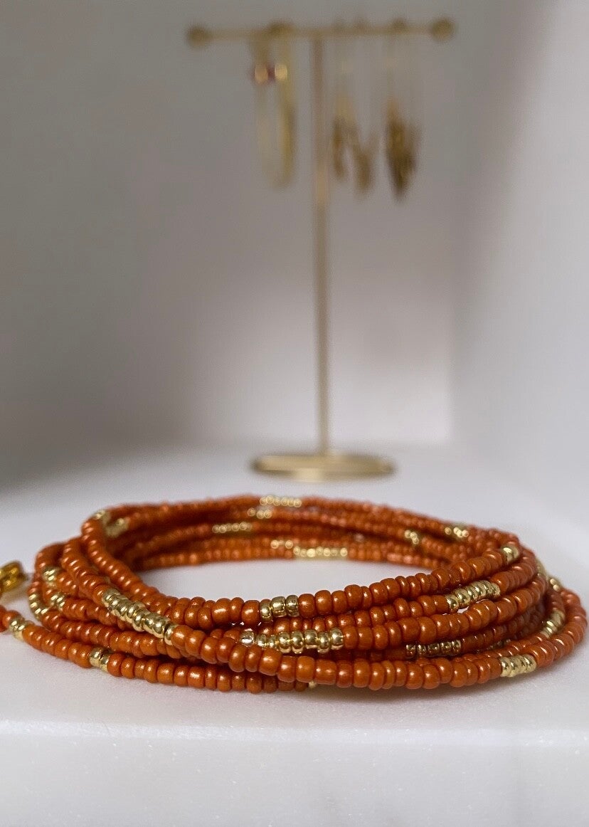 Armband in eenwarme kleur rood met goud tinten. Meerdere keren om je pols te wikkelen maar ook als ketting te dragen.