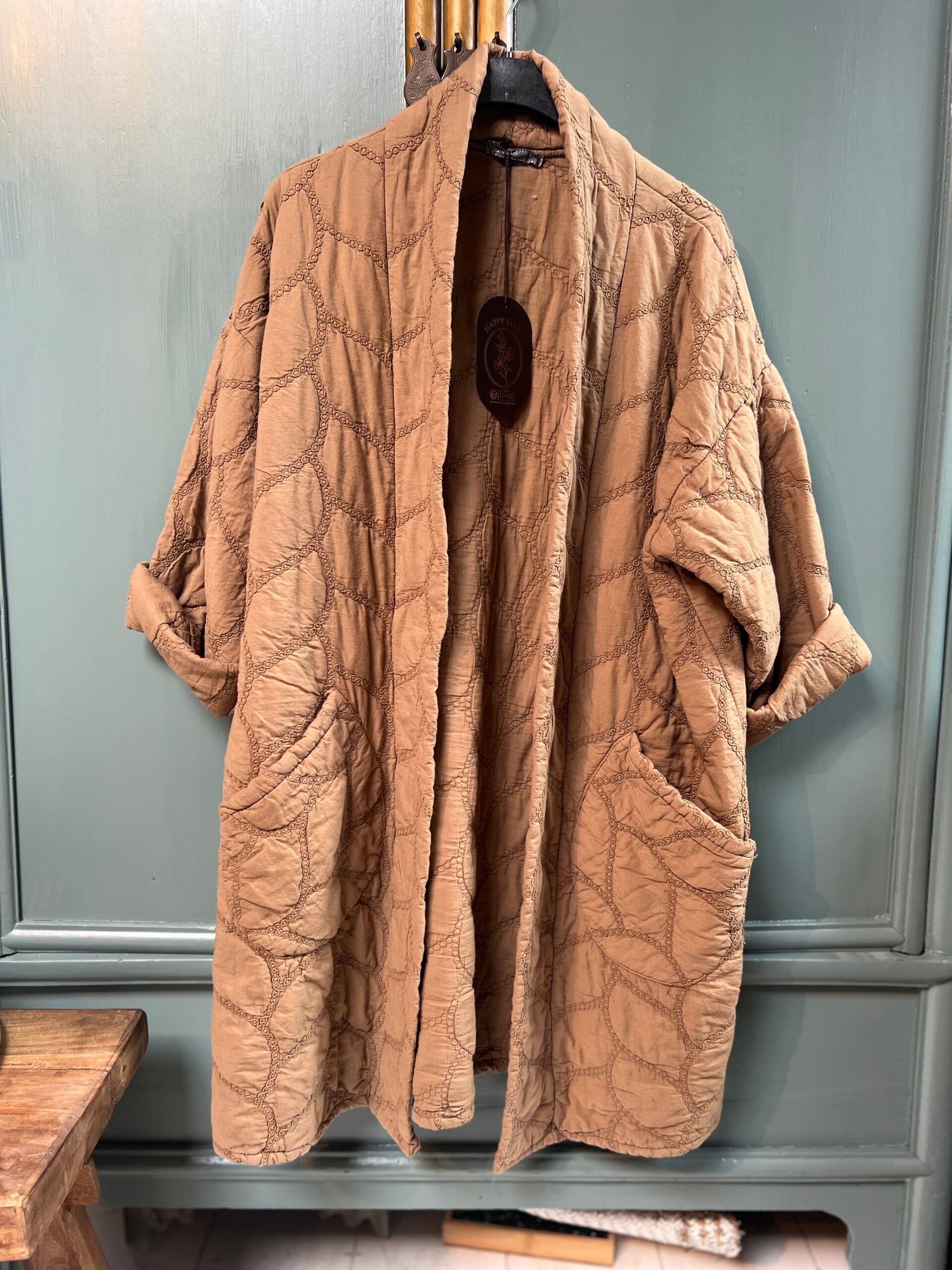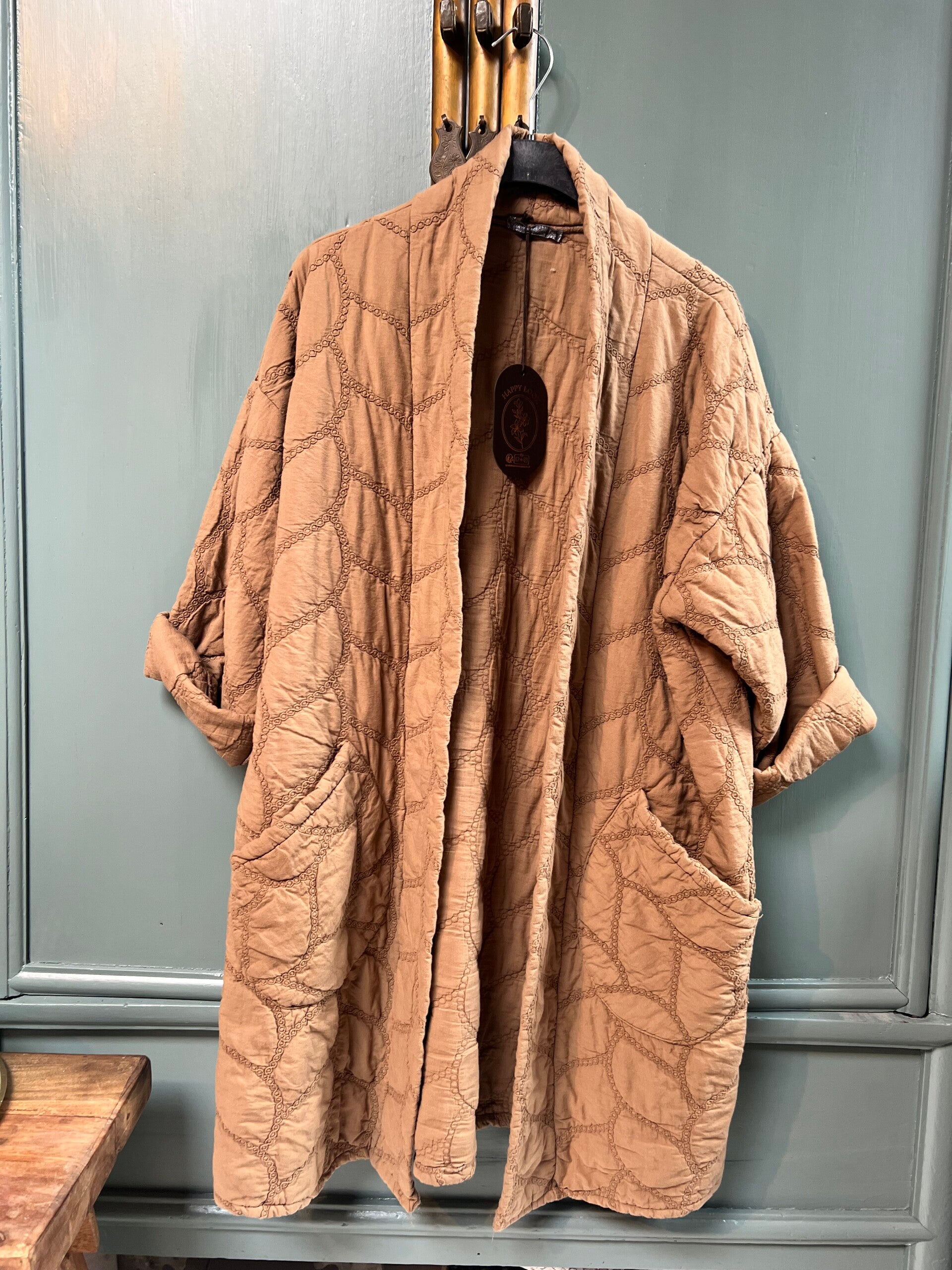 Lange jas in kimonostijl van gewatteerd katoen met borduursel en zakken. Enkele maat 36/44 (S-XXL).