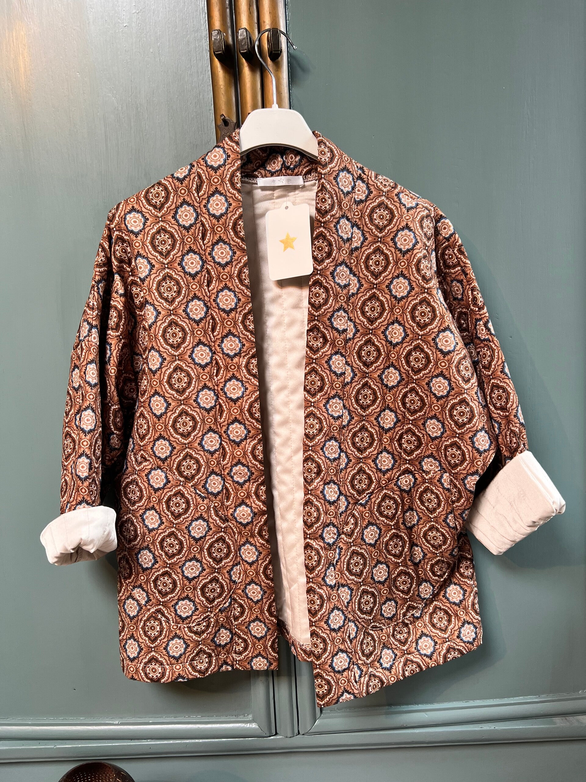 Leuk model jasje met mooie print. Het jasje is gevoerd en staat stoer als je het draagt met opgerolde mouwen. In twee kleuren te bestellen Alleen nog in het zand kleur te bestellen.