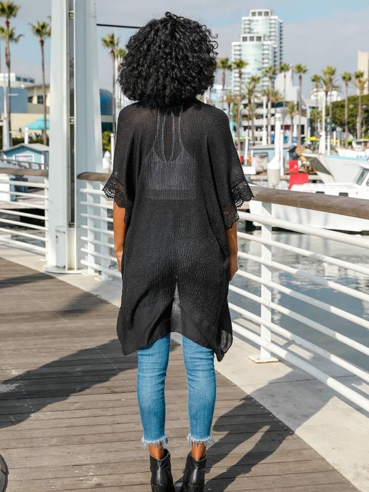 Mooie zwarte Kimono met kanten randen. Driekwart mouw en ook afgezet met kant. Heerlijk om in de zomer te dragen over je badkleding op het stand. Maar star natuurlijk leuk zoals afgebeeld op je jeans of over een jurkje heen te dragen. Klaar om te flaneren op de boulevard.