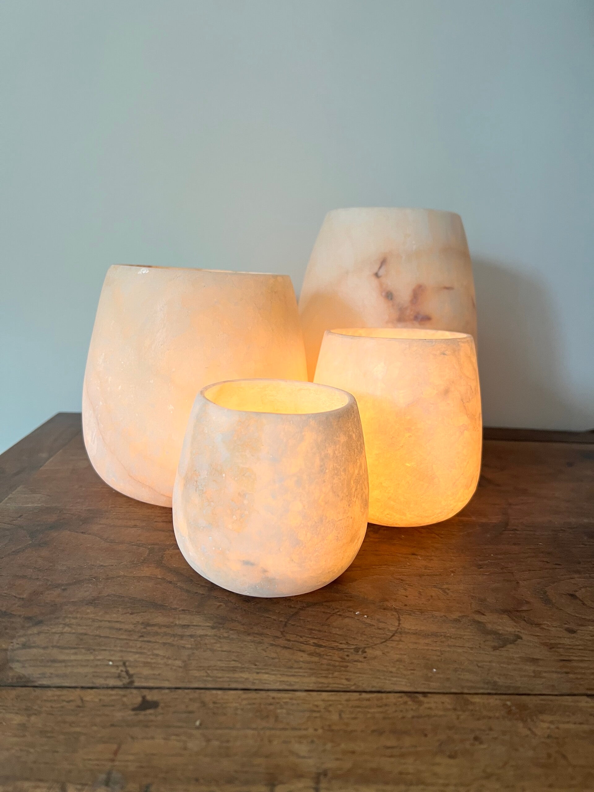 Deze Oosterse waxinelichthouders uit Egypte zijn met de hand gesneden, gefreesd en geschuurd. Alle Albaster kandelaars zijn uniek van vorm, kleur en afmetingen.