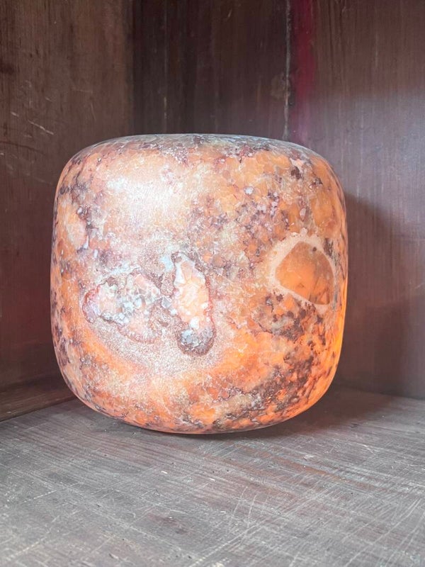 Alabaster is een poreuze steen met kleine kristalachtige stukjes steen. Daarom schijnt het kaarslicht er zo mooi doorheen. Doe er een kwaliteits waxine lichtje erin.