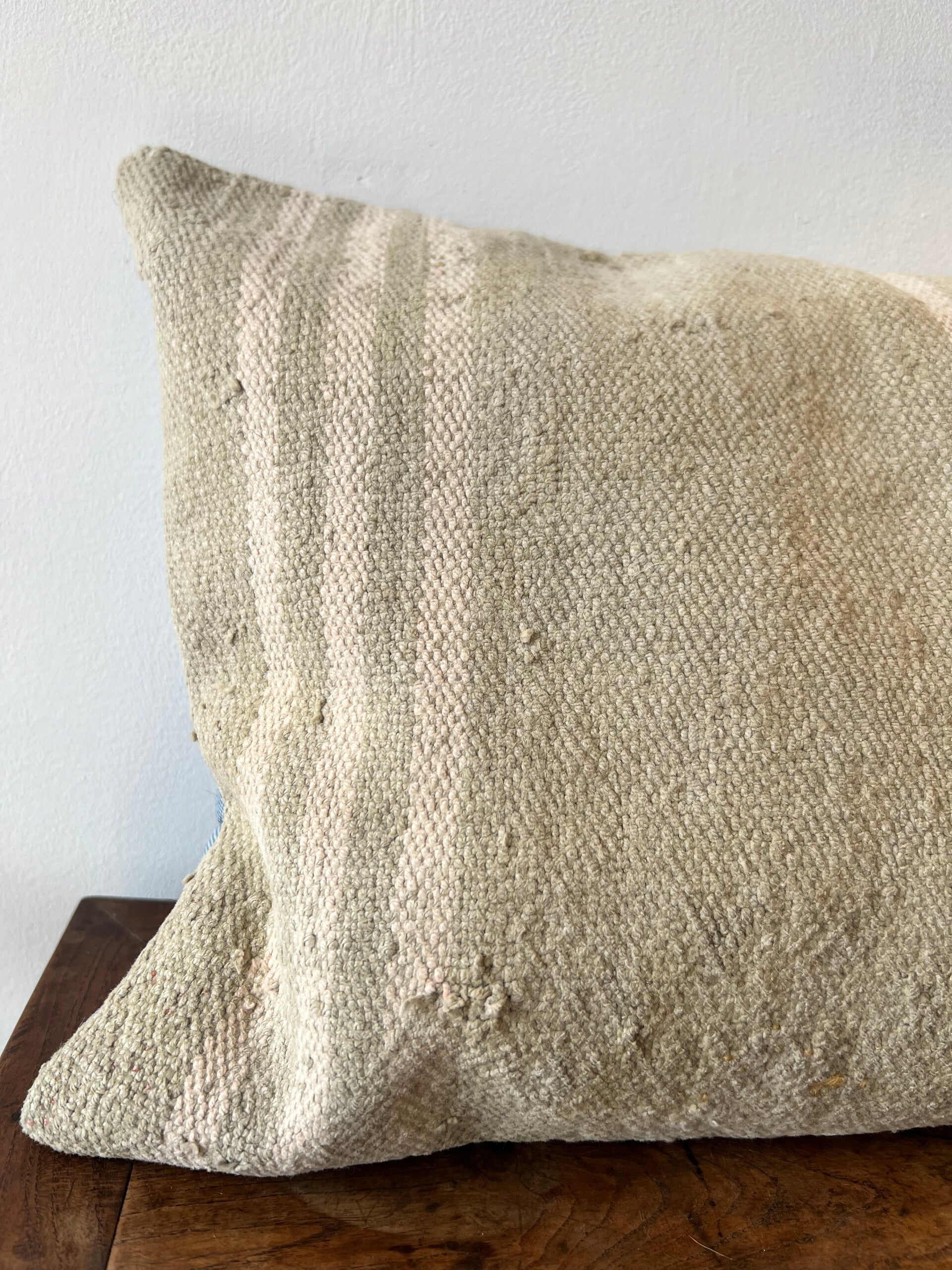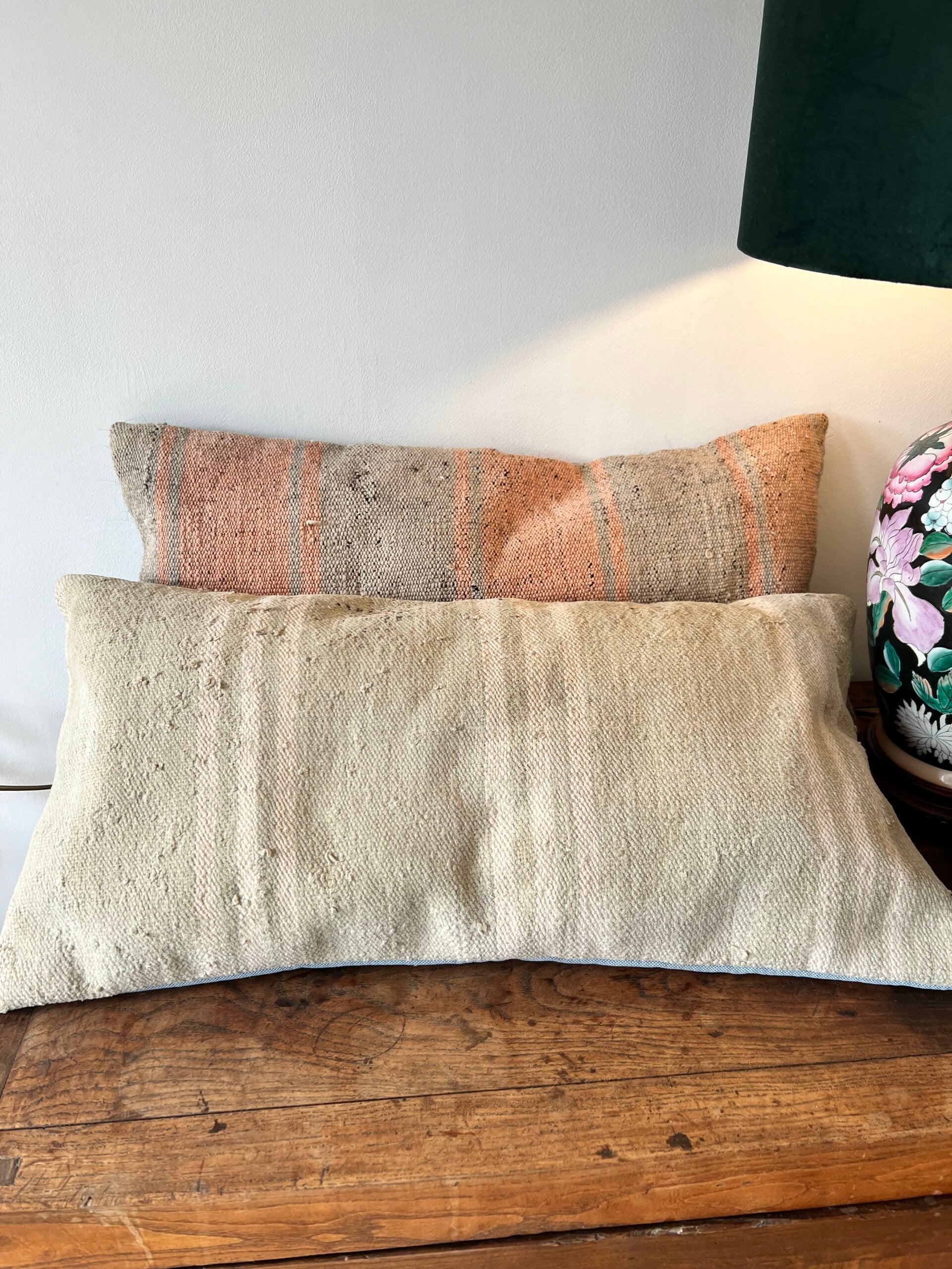 Mooie stoere Kelim kussen. In een zachte natuurlijke tint. Prachtig afgewerkt met een rits aan de achterzijde. Perfecte lende kussens en leuk om bij andere kussens te combineren.