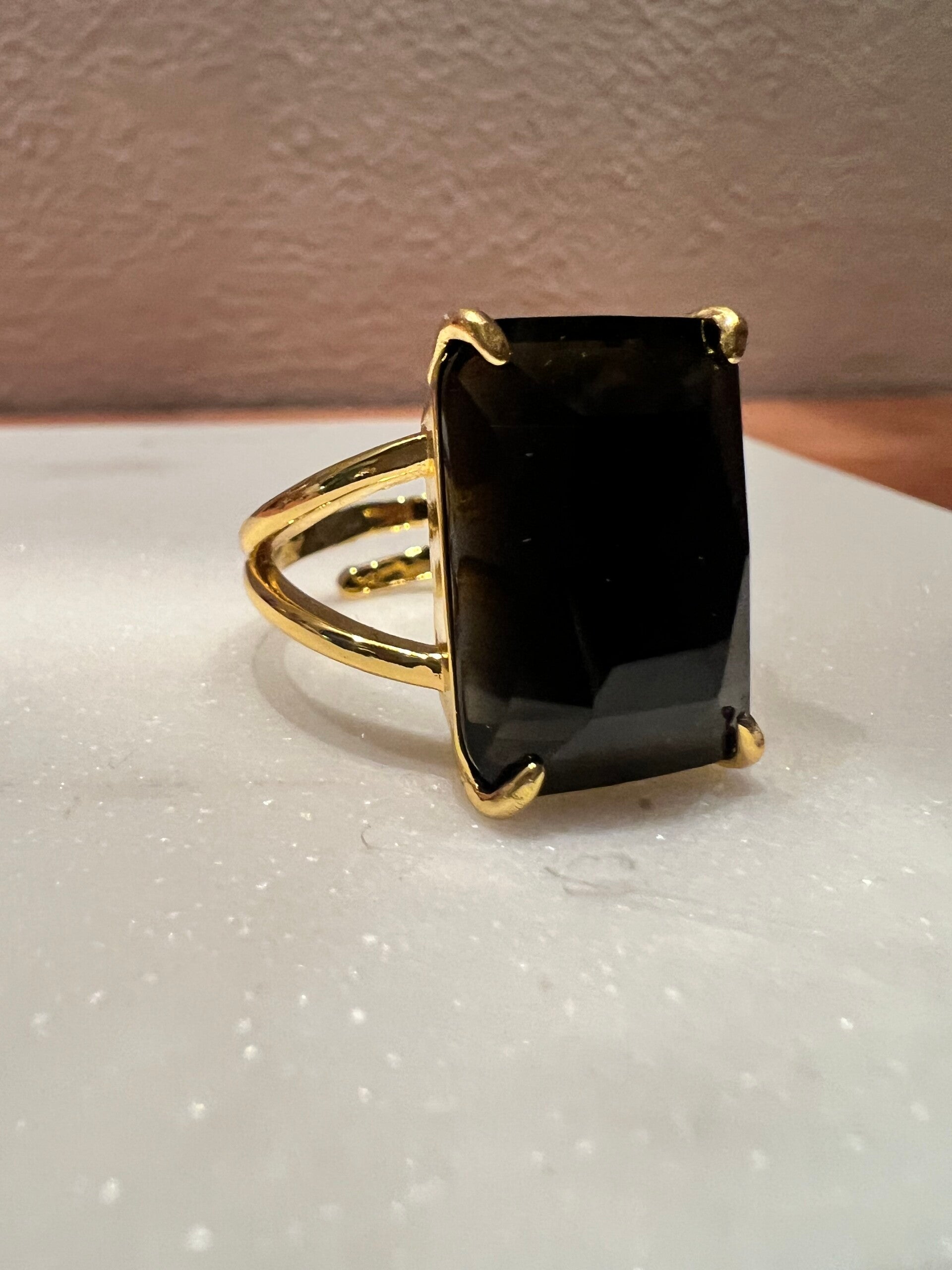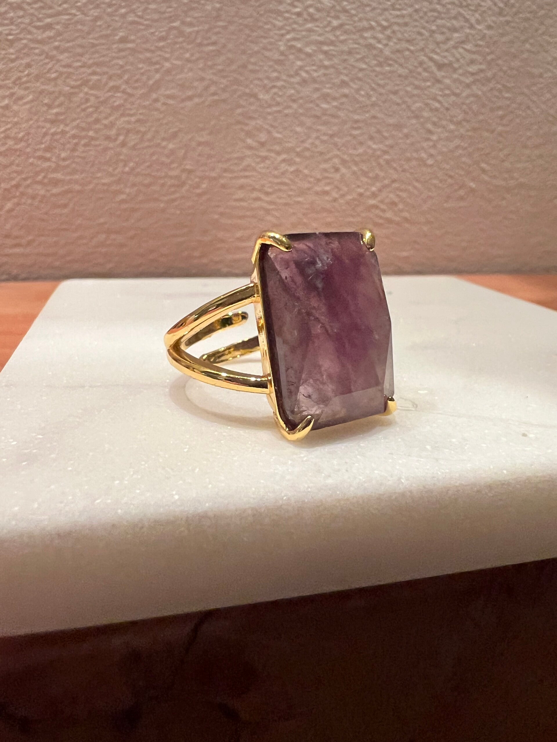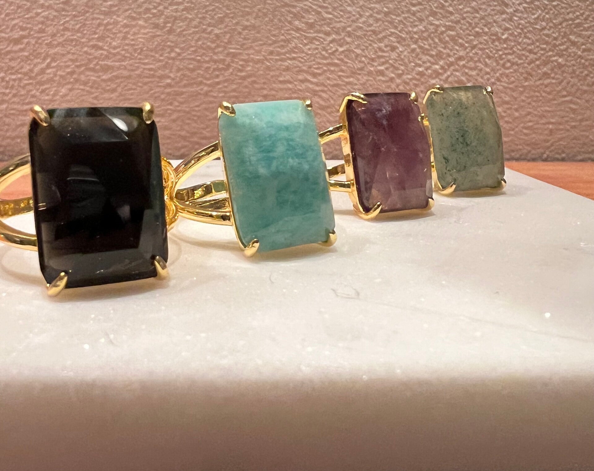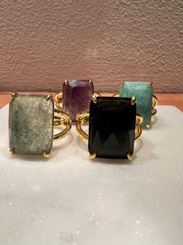 Mooie stalen ring met een facet geslepen Natuursteen de licht groene Amazoniet. Ze passen altijd want ze zijn verstelbaar. Let op met bijtende stoffen dan houd je mooie glans op je gouden ring.