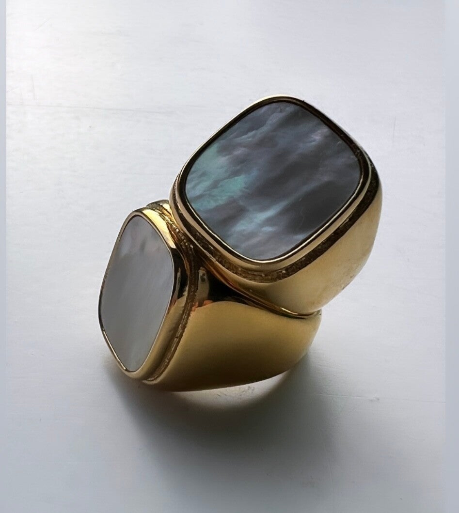 Mooie stalen ring met een paarlemoer inleg. Maten zijn 8.