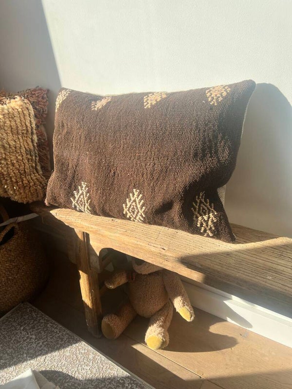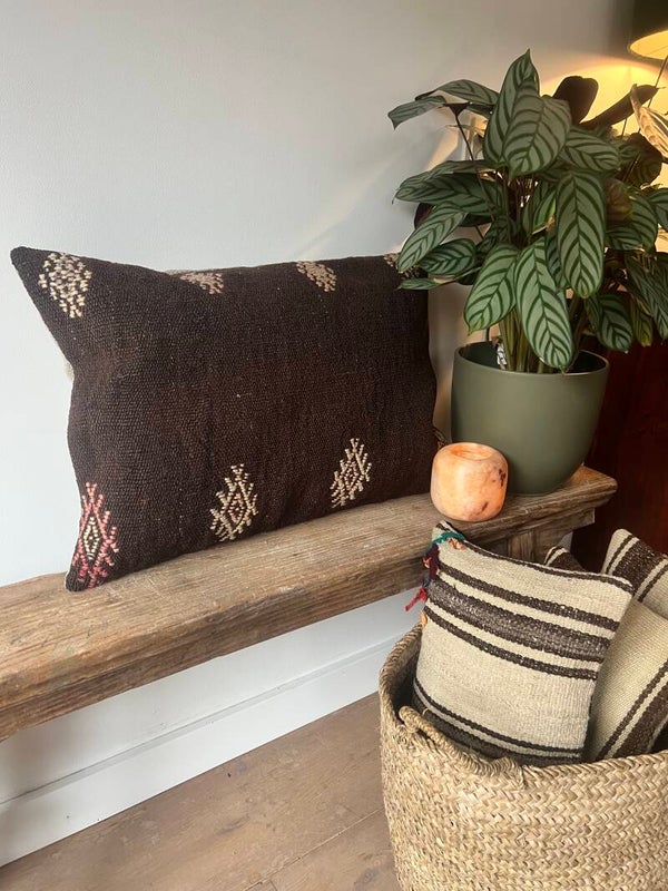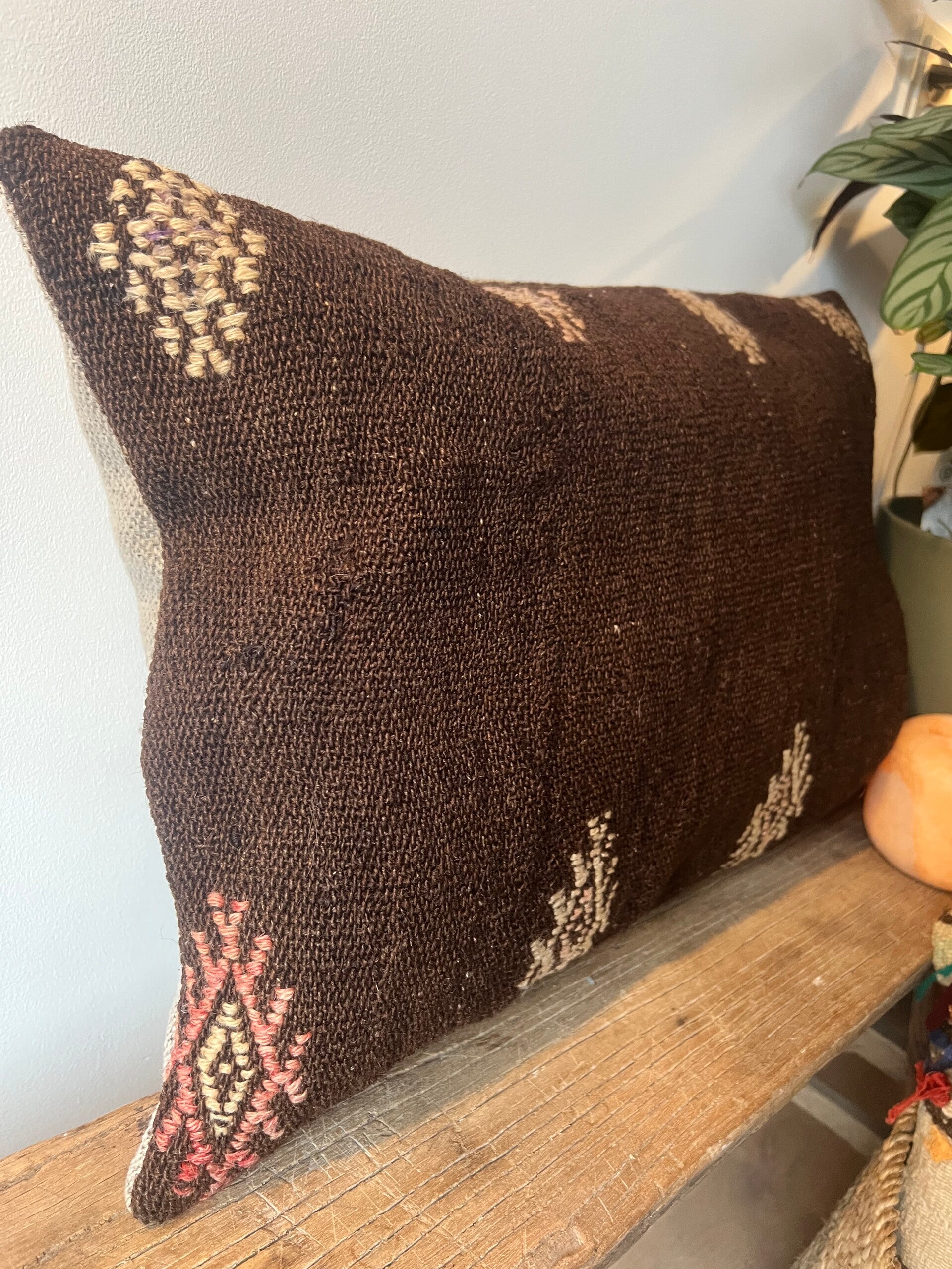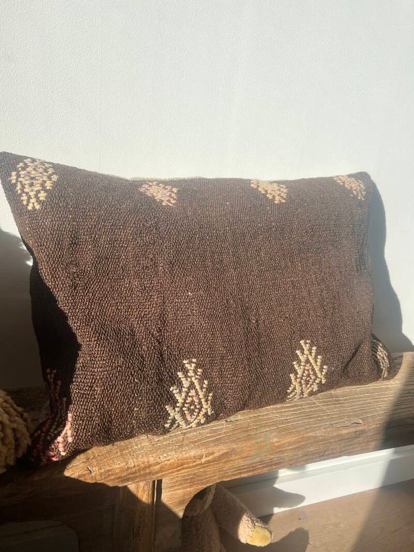 Mooie kelim kussen donker bruim met een motief erin. Leuk te combineren met andere kelim kussens.