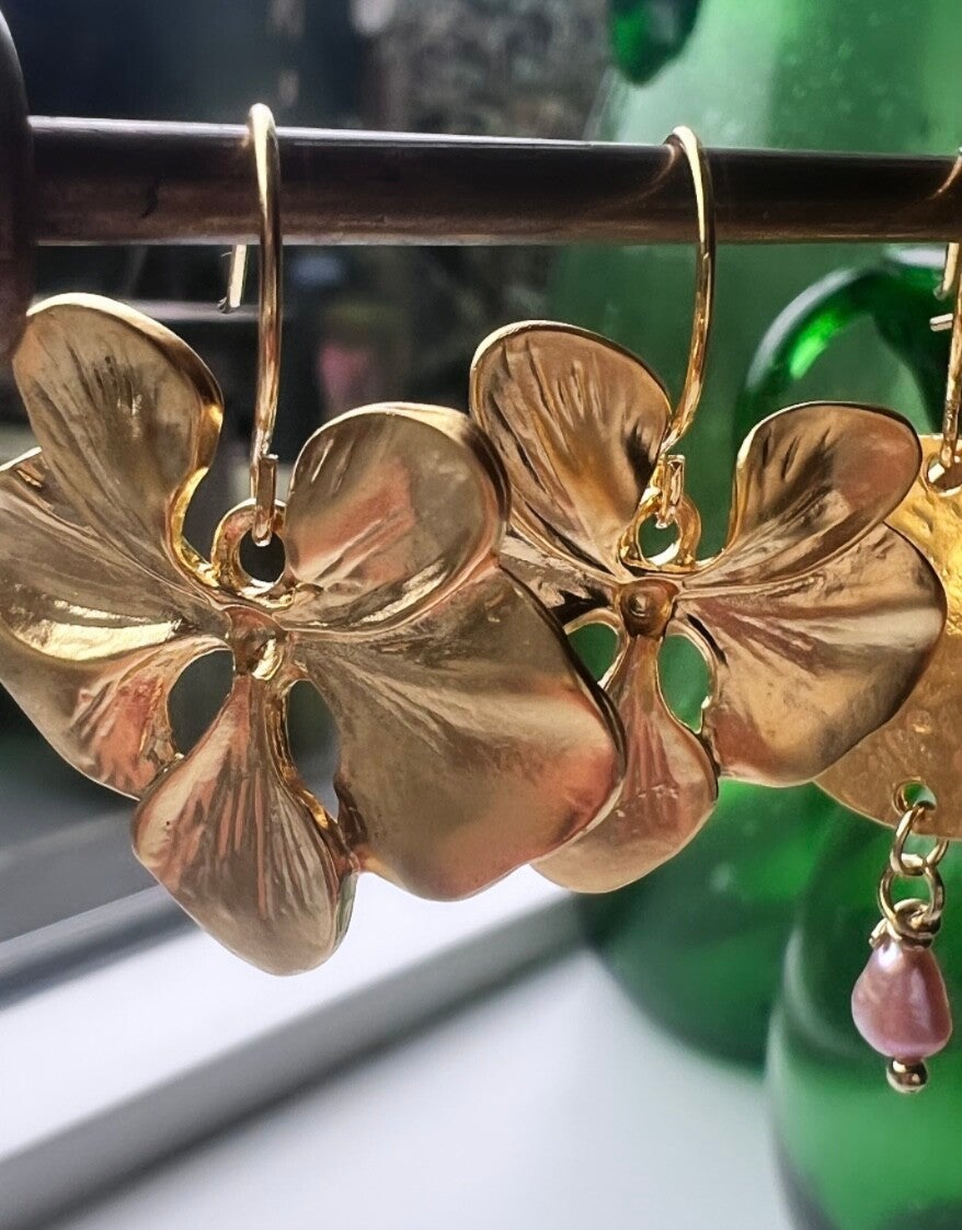 Prachtige oorbellen in de vorm van een bloem blad. Vergulde bedels.