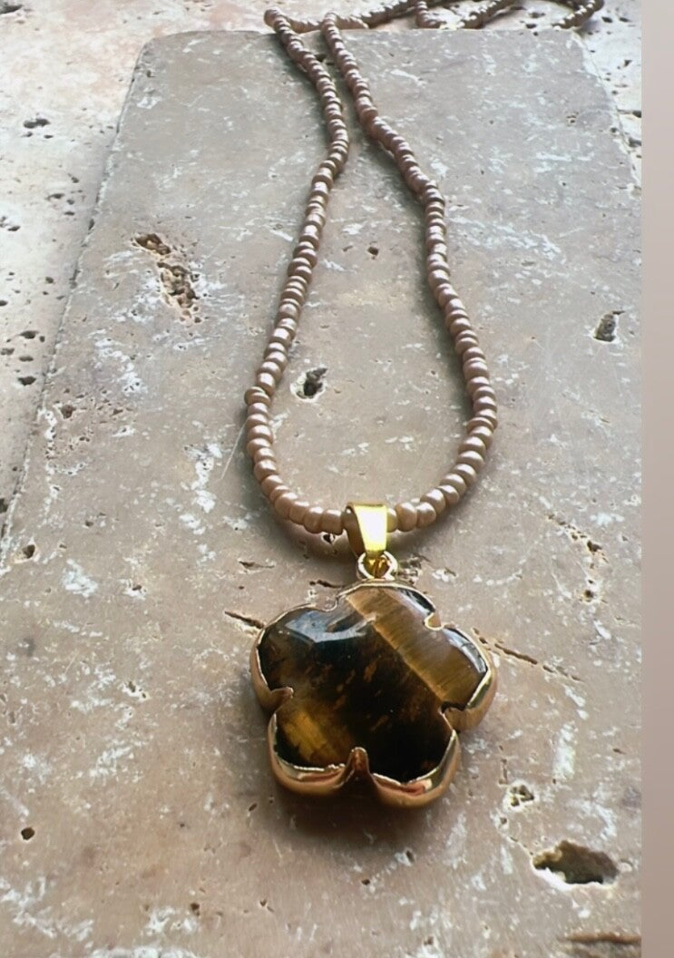 Hoe schattig is deze dan! Een bloem bedel gemaakt van een natuursteen de tijger oog! De bedel is gelegd in een verguld laagje.