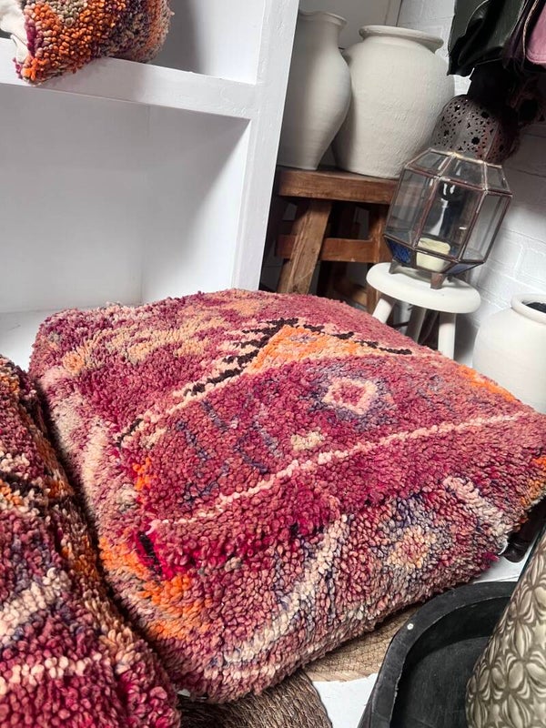 Prachtige wollen berber poef. Mooie kleuren verwerkt in deze twee poefs. Uit een zelfde tapijt gemaakt.