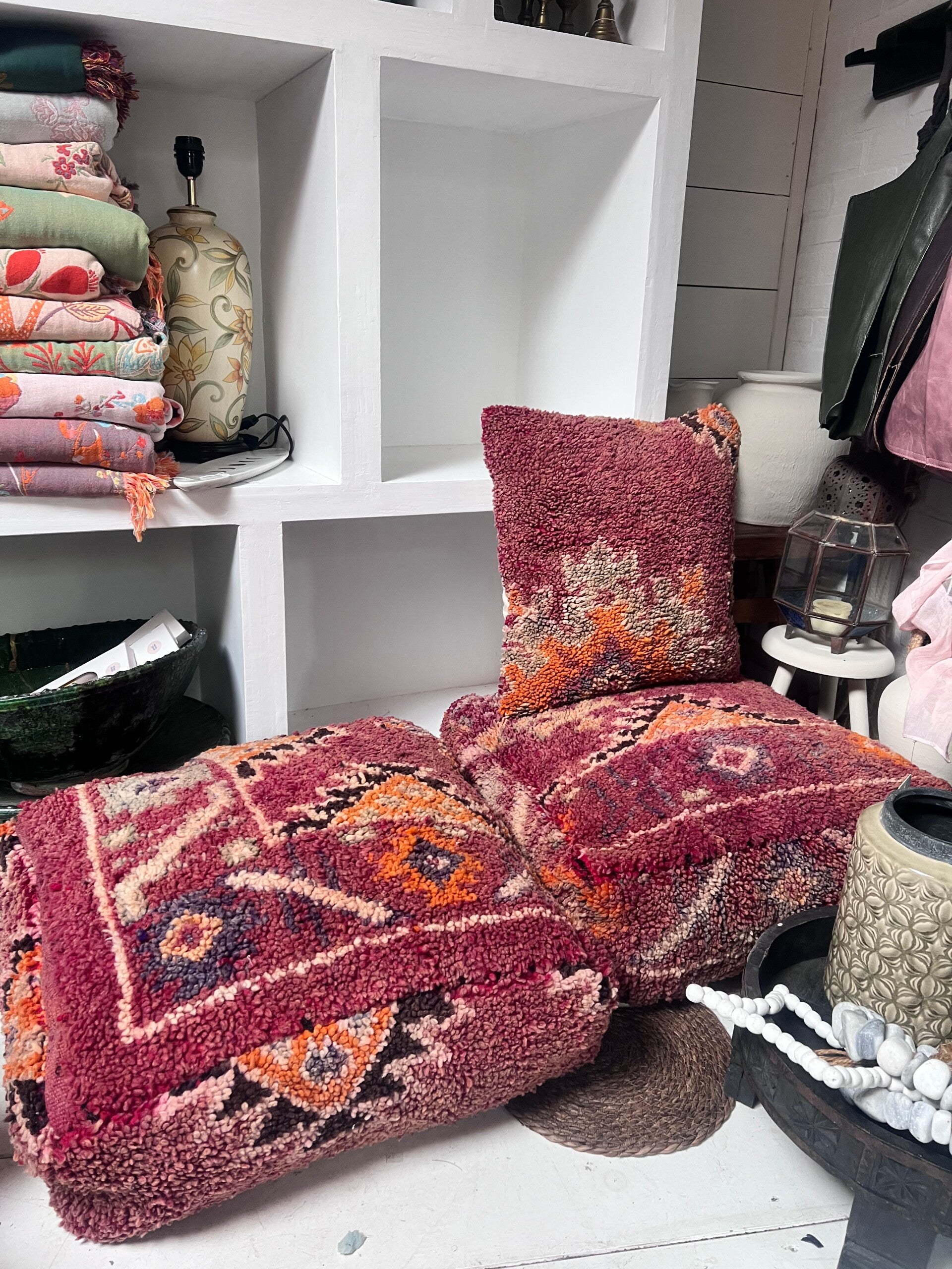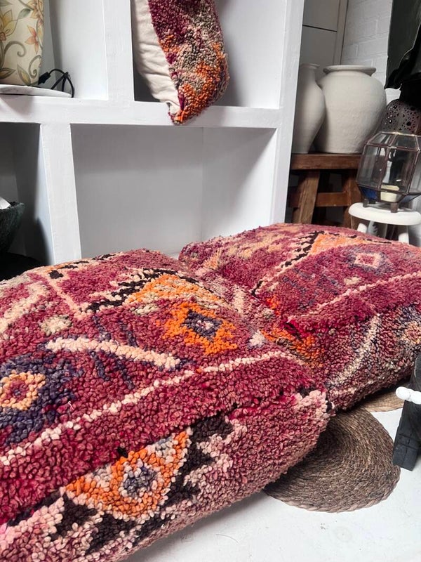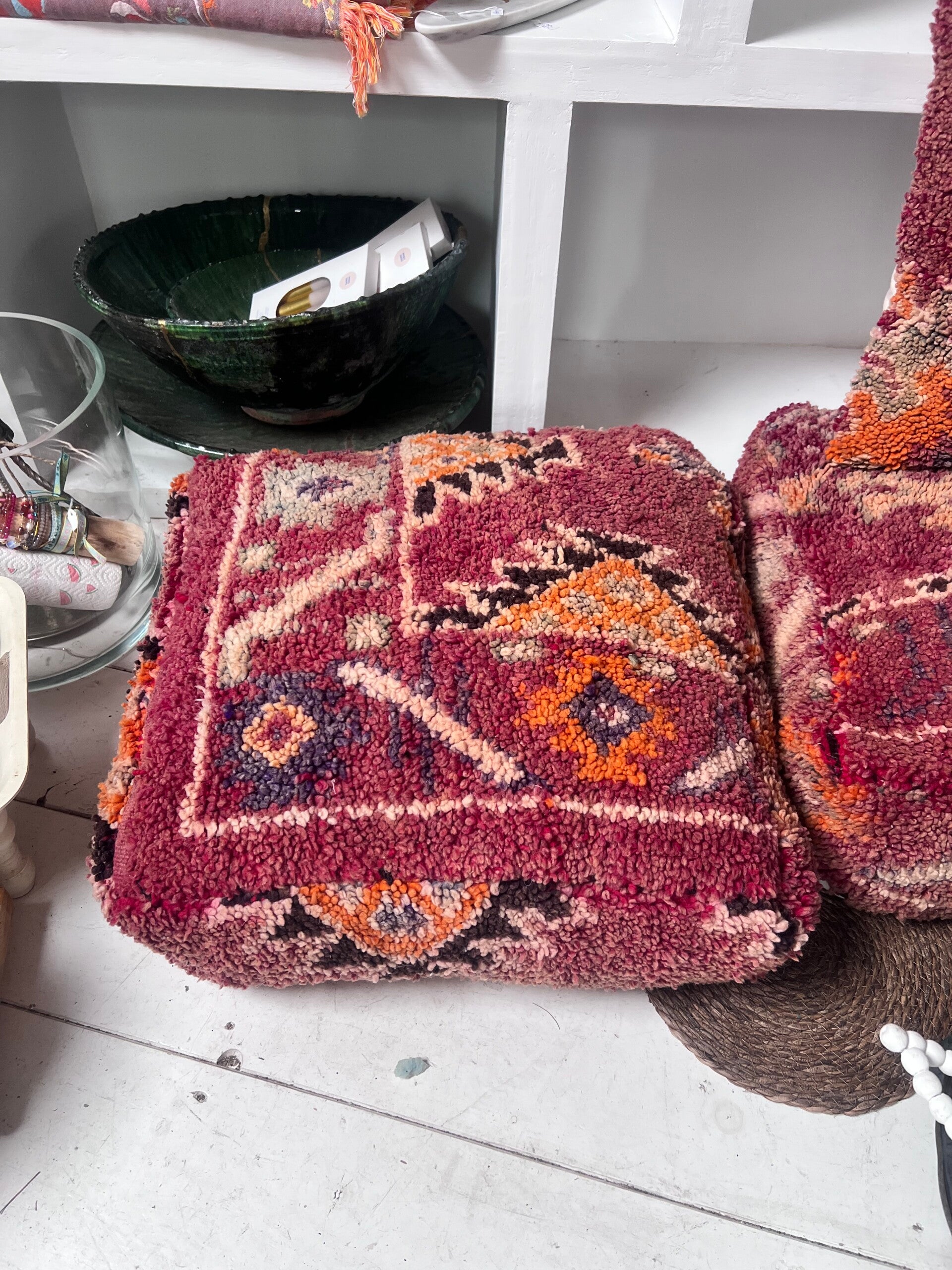 Prachtige wollen berber poef. Mooie kleuren verwerkt in deze twee poefs. Uit een zelfde tapijt gemaakt.