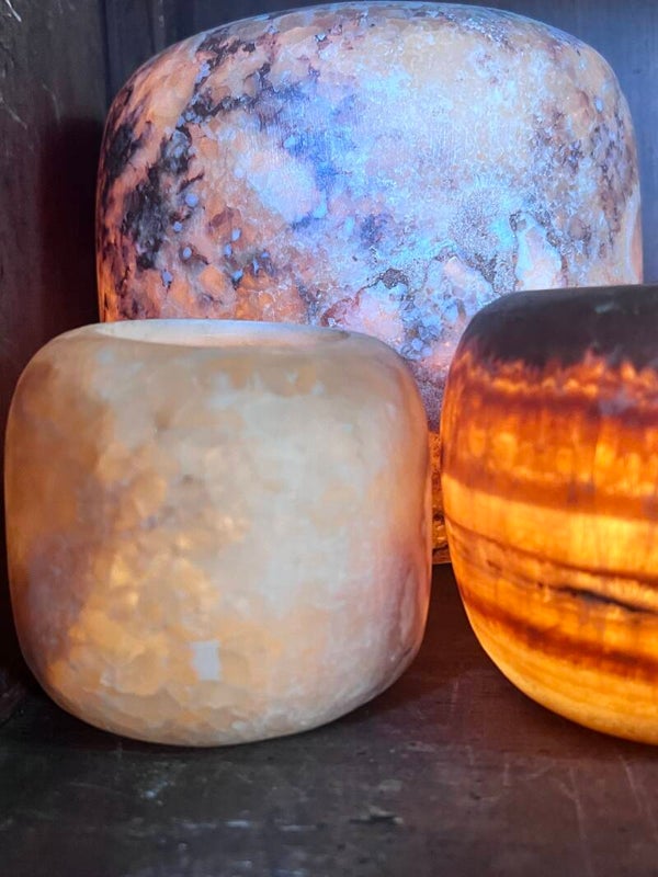 Albasten windlicht bol, deze waxinelichthouders zijn gemaakt van Alabaster en worden vakkundig vervaardigd uit gekristalliseerd steen uit de eeuwenoude woestijn in Egypte. Met een waxinelichtje erin geeft het een warm en magisch licht.