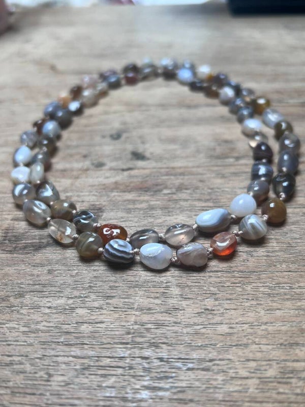 Prachtige ketting elke natuursteen is geknoopt. Wikkel het om je hoofd en draag het in lagen. Of natuurlijk lekker lang om je hals laten hangen. Deze ketting is zonder sluiting en rondom geknoopt.