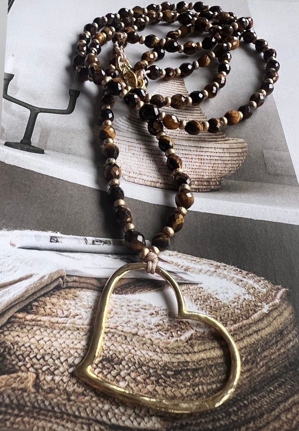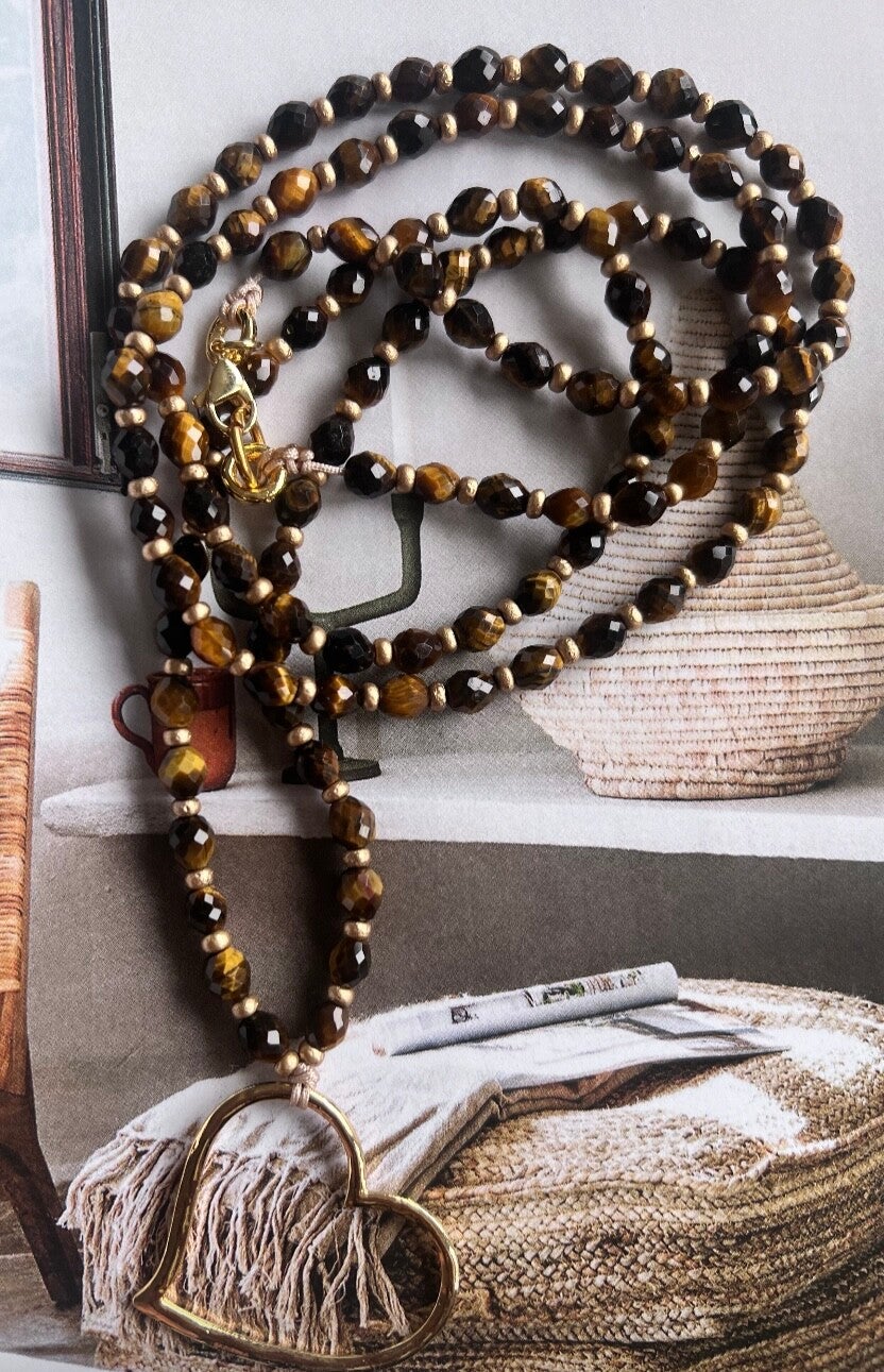 Super mooi gouden hart aan een ketting met facet geslepen tijger oog. Het hart is licht gehamerd. Tussen de tijger oog kralen zitten gouden fijne glas kraaltjes.