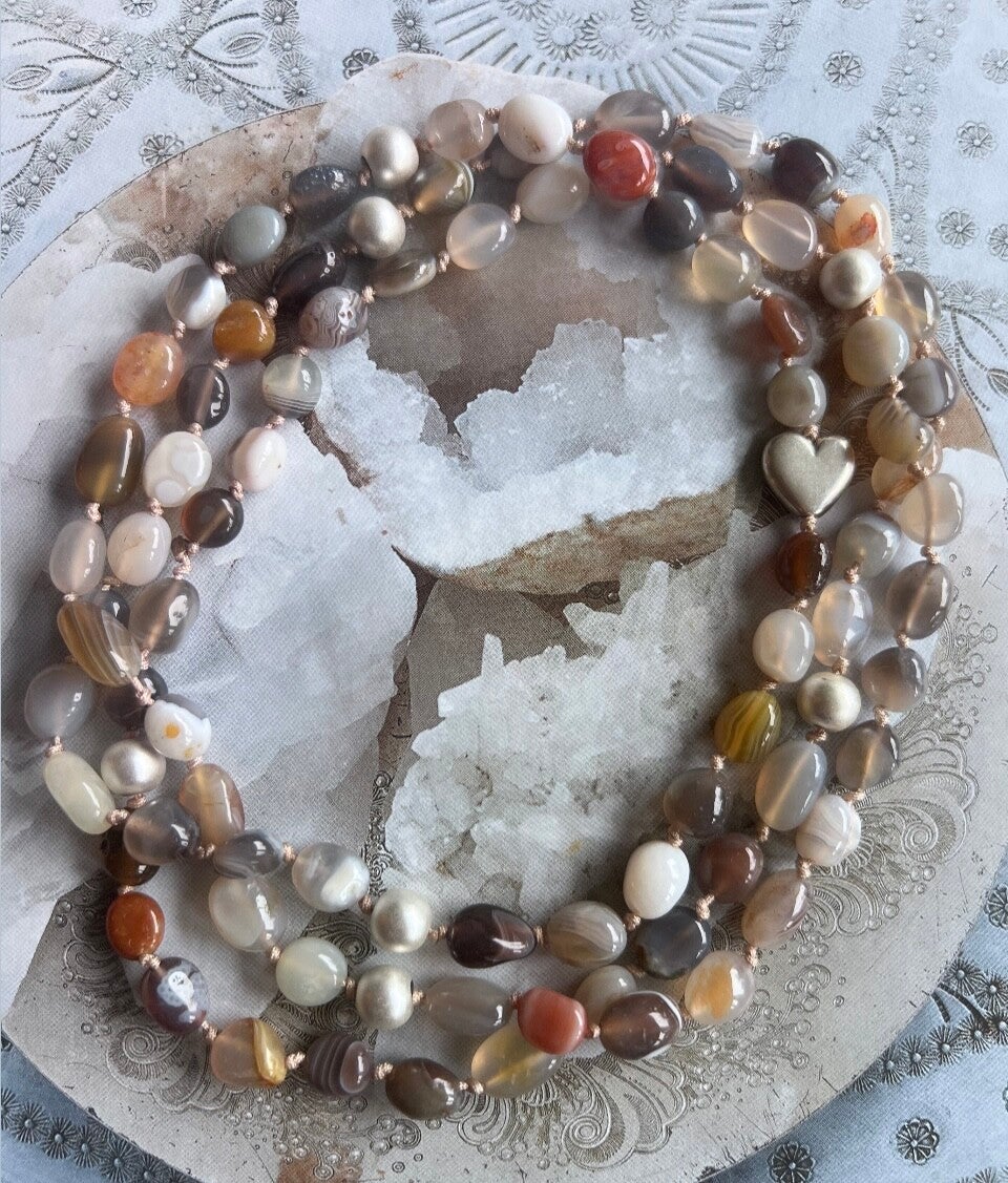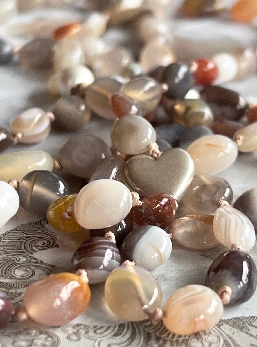 Lange mooie ketting met matte zilveren kralen en Agaat kralen. Mooie warme kleuren met die zilver tinten erdoor. Ook deze lange ketting is mooi te combineren met andere kettingen. Je kunt de ketting op verschillende manieren dragen.