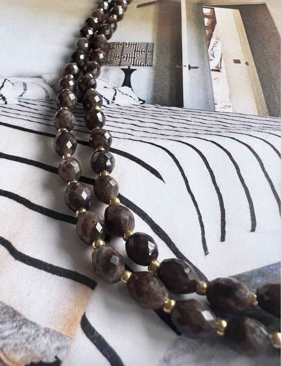Prachtige Facet geslepen bruine Laboriet kralen. Tussen door mooie kleine gouden glas kraaltjes.