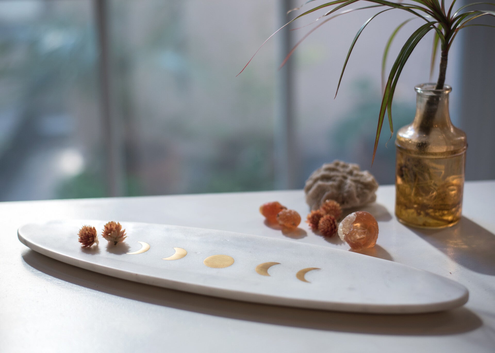 Dit marmeren plateau is een perfect cadeau voor iedereen die van de maan houdt. Het marmer is namelijk versierd met een maanthema, van koper worden 5 van haar fases uitgebeeld. Gebruik dit mooie marmere dienblad/plateau om bijvoorbeeld je kristallen in het maanlicht op te laden, of als een bijzondere toevoeging op je huisaltaartje.