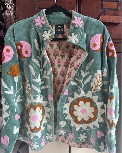 Deze jackets is gemaakt van velvet stof en geborduurd met de mooiste garen. Alles is zorgvuldig geselecteerd met respect voor mens en planeet.